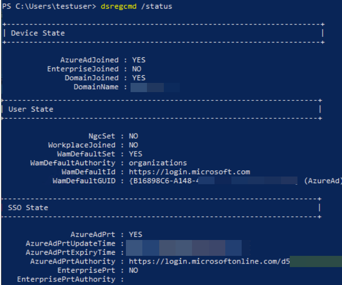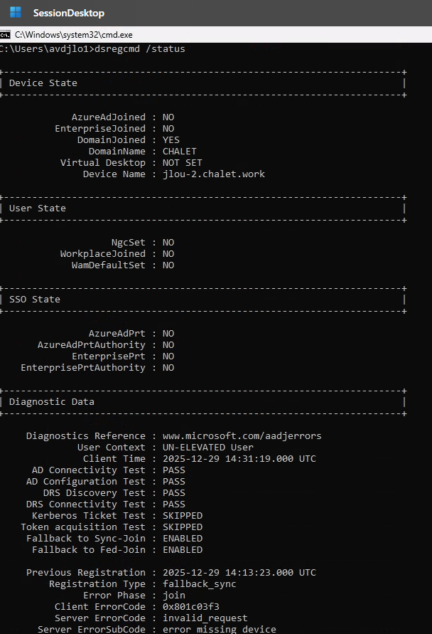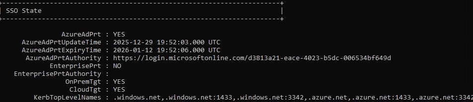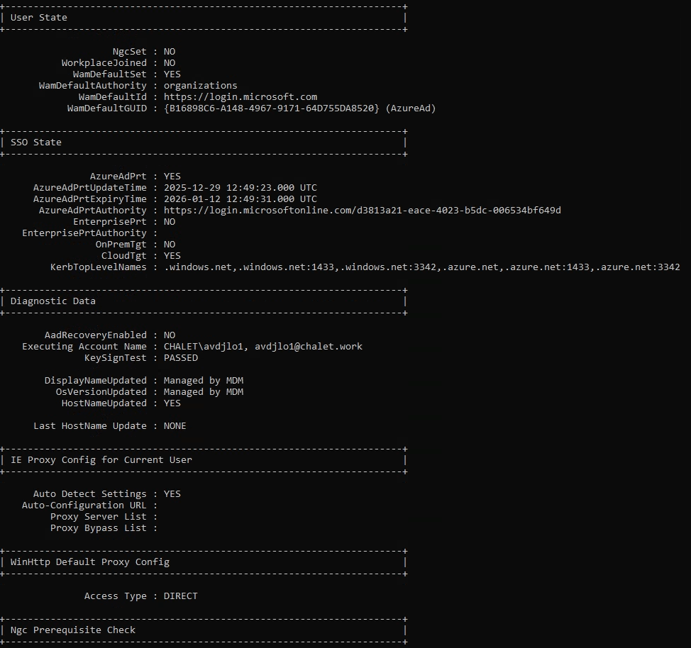 Une fois dans la session Windows, dsregcmd nous affiche les informations suivantes :