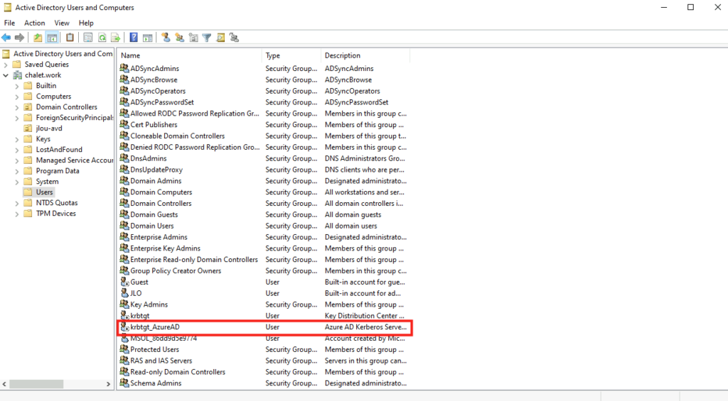 Enfin je constate la présence krbtgt_AzureAD utilisé par les DC pour signer les TGT Kerberos. Il s’agit d’une séparation cryptographique claire avec krbtgt dans le cadre de Kerberos émis depuis Entra :