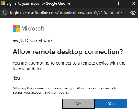 Entra veut un consentement explicite de l’utilisateur. Ce message ne correspond pas à une authentification supplémentaire, mais à une demande de confiance entre l’utilisateur et le session host :