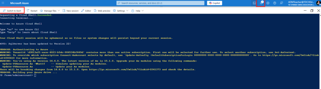 Commençons par autoriser Microsoft Entra dans l’authentification pour Windows sur le tenant. Pour cela, j’utilise Azure Cloud Shell depuis le portail Azure :