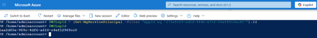 $WCLspId = (Get-MgServicePrincipal -Filter "AppId eq '270efc09-cd0d-444b-a71f-39af4910ec45'").Id
