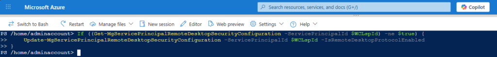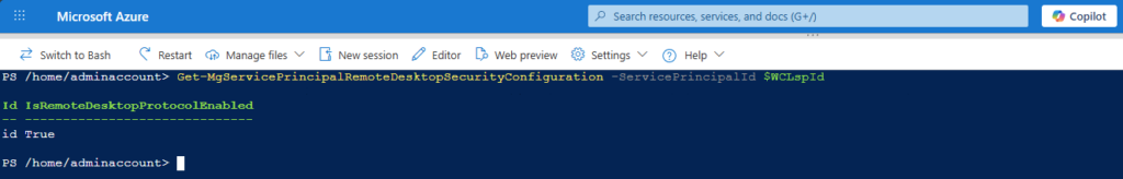 Update-MgServicePrincipalRemoteDesktopSecurityConfiguration -ServicePrincipalId $WCLspId -IsRemoteDesktopProtocolEnabled