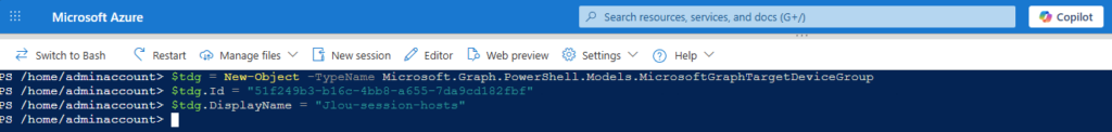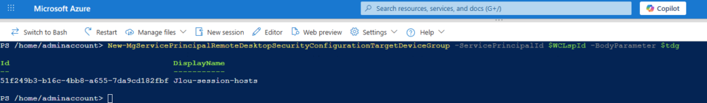 New-MgServicePrincipalRemoteDesktopSecurityConfigurationTargetDeviceGroup -ServicePrincipalId $WCLspId -BodyParameter $tdg