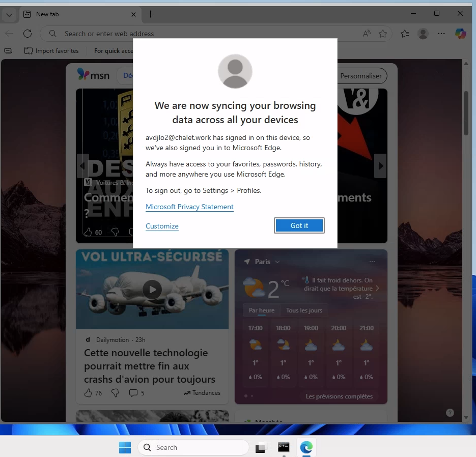 Quelques minutes plus tard, j’ouvre Microsoft Edge et je constate l’authentification automatique de mon compte Cloud correspondant :
