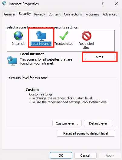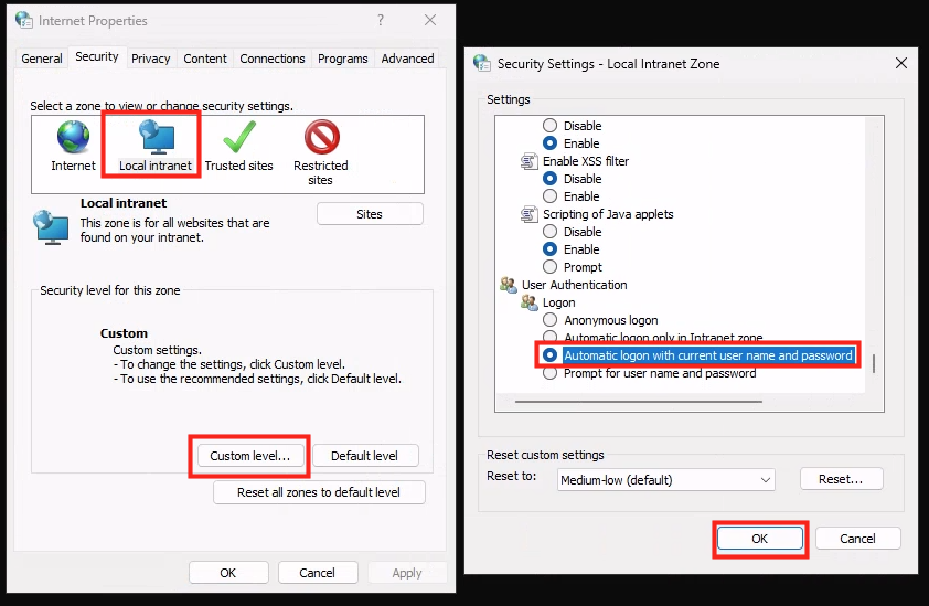 Toujours dans Intranet Local, je coche Connexion automatique avec le nom d’utilisateur et le mot de passe actuels :