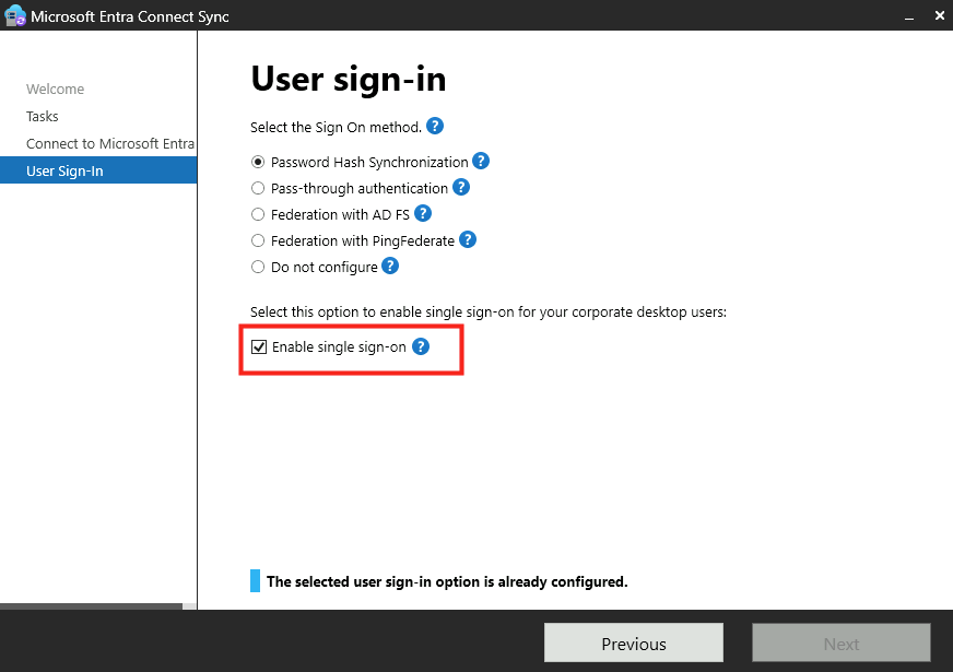 Je décide donc d’activer la fonctionnalité SSO dans Entra Connect Sync :