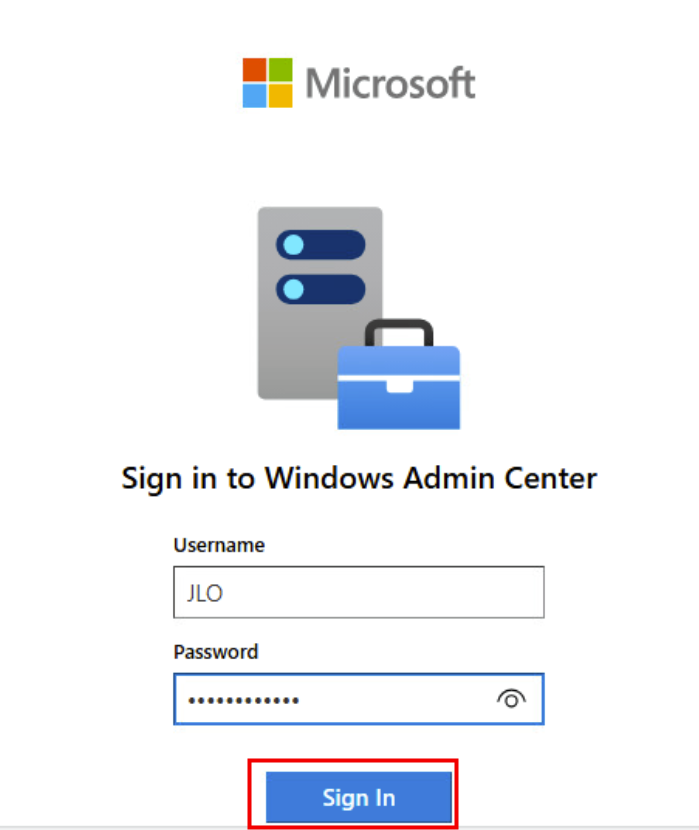 Une fois l’installation terminée, ouvrez la page de Windows Admin Center, puis authentifiez-vous avec votre compte :