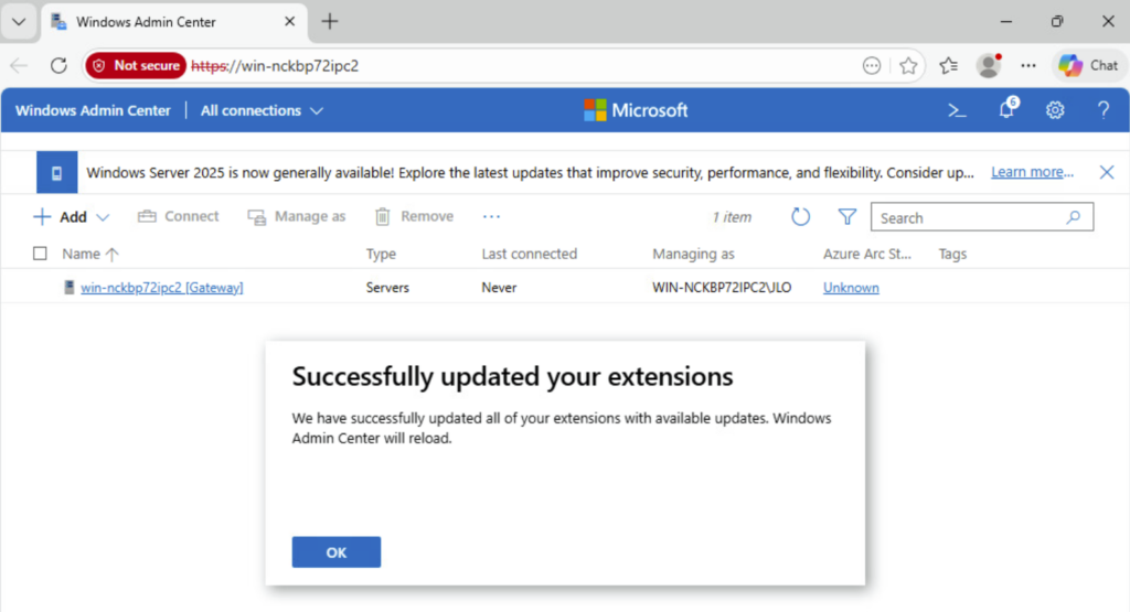 Une fois connecté dans la console Windows Admin Center, attendez quelques minutes la fin de l’installation des extensions préinstallées :