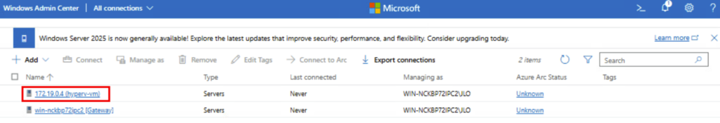 Etape III – Connexion à Hyper-V depuis WAC :