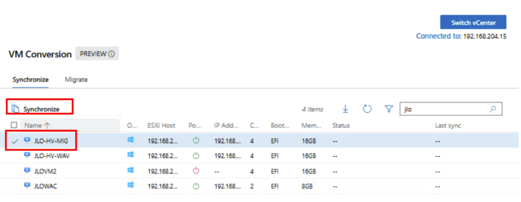 Toujours dans la liste des machines virtuelles, cochez sur une des VMs Windows disponibles, puis cliquez ici pour démarrer la synchronisation :