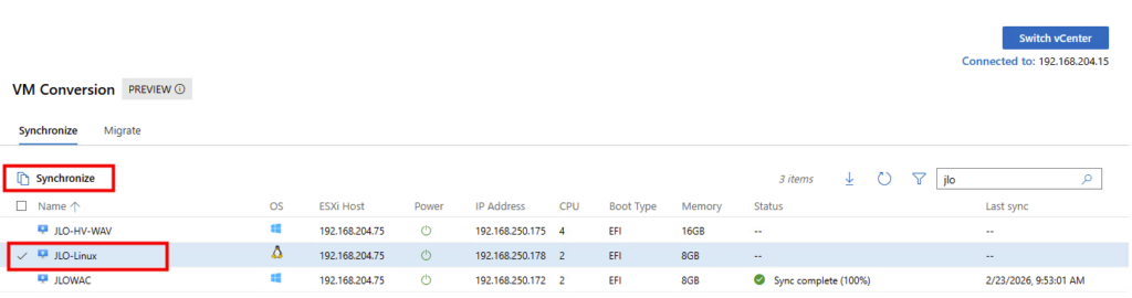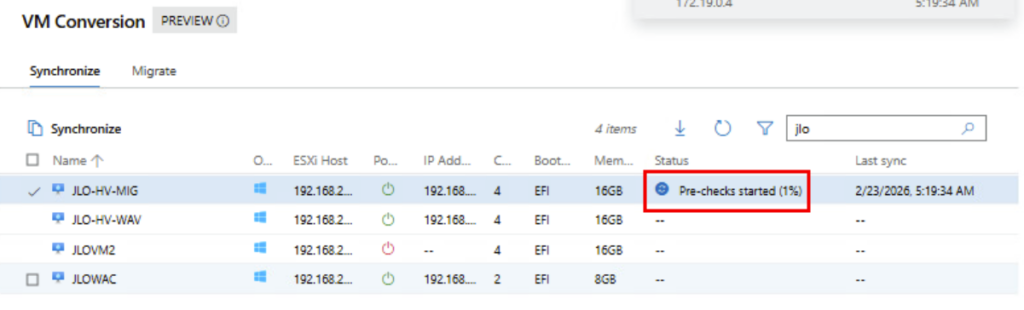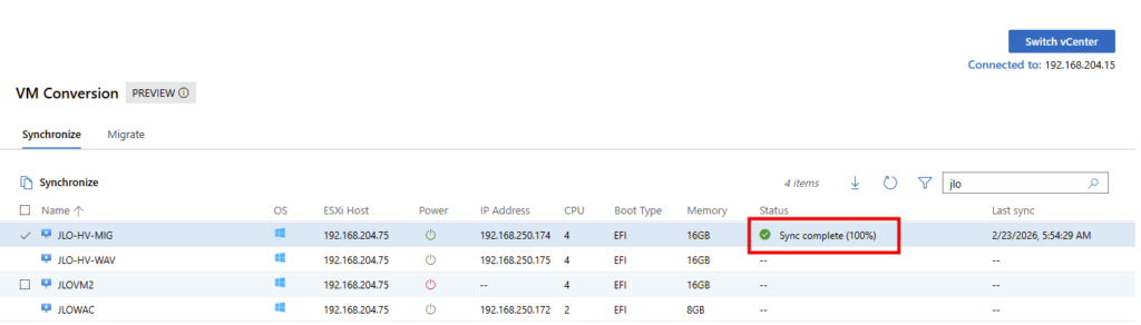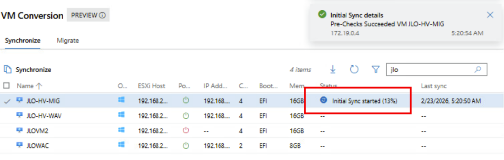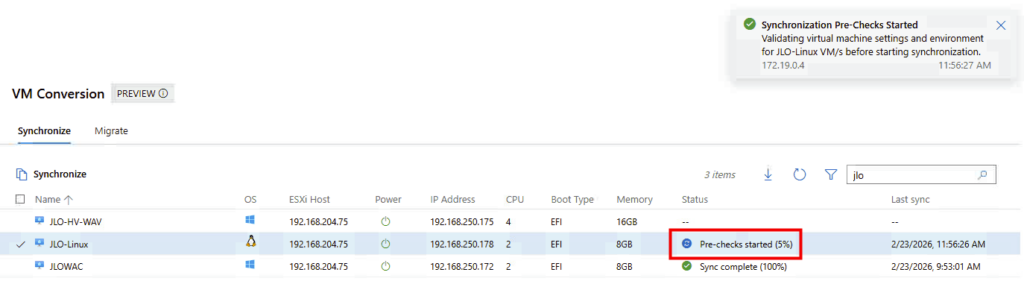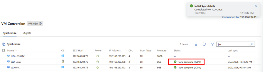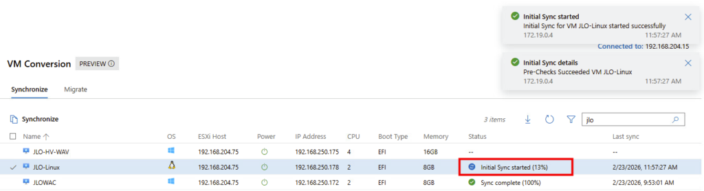 Synchronisation : l’extension effectue une copie complète initiale des disques de la machine virtuelle pendant que la VM source continue de fonctionner. Cette phase minimise les temps d’arrêt en vous permettant de planifier la migration finale à un moment qui vous convient.