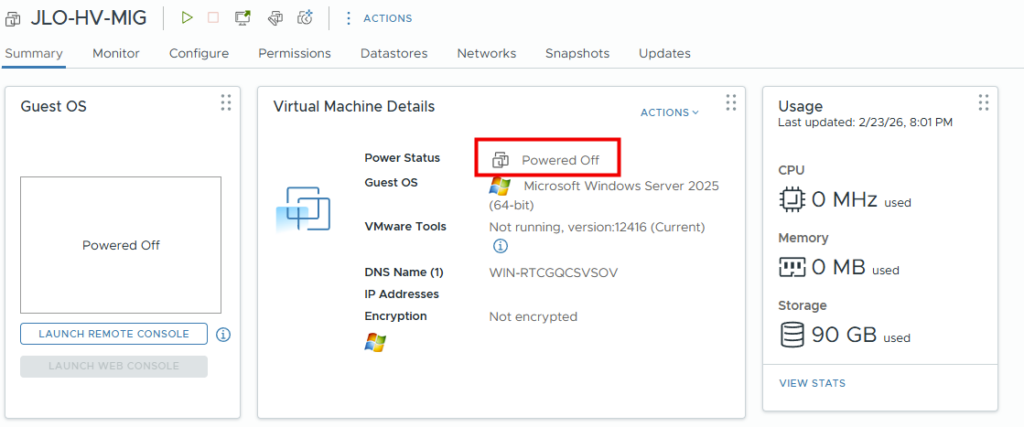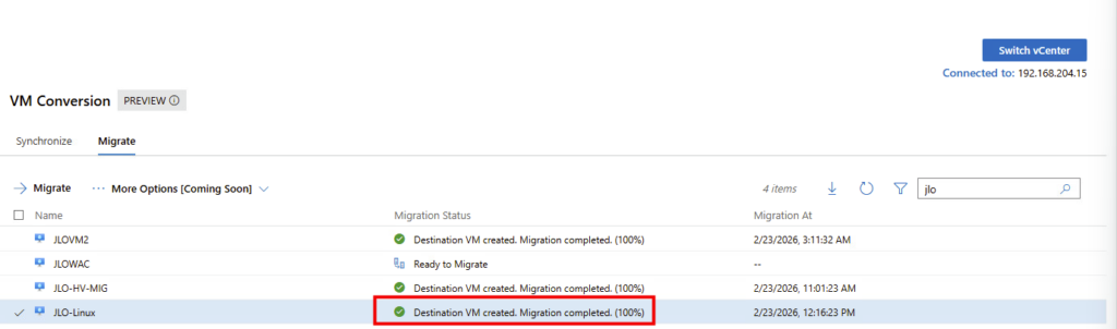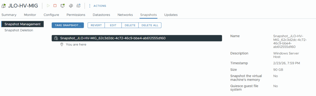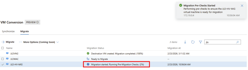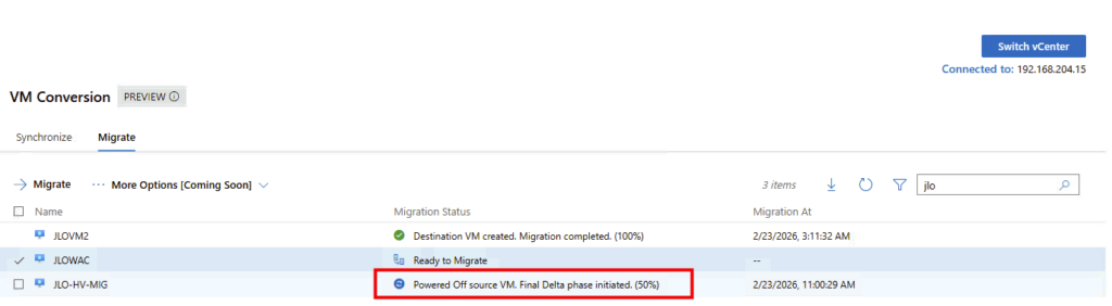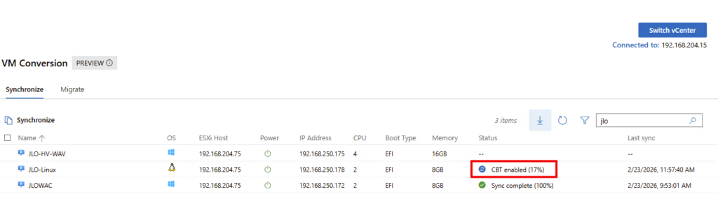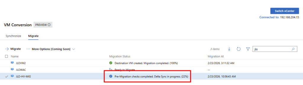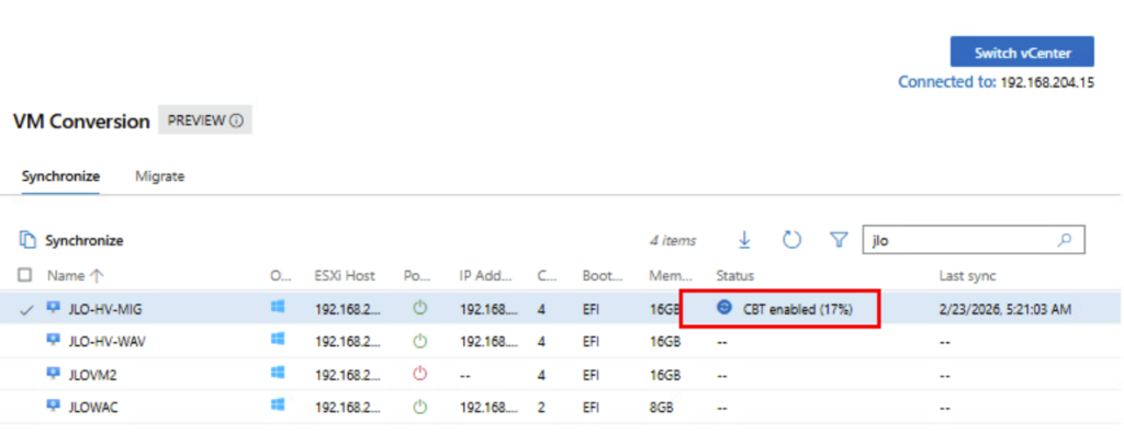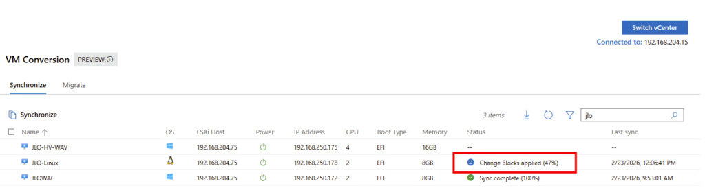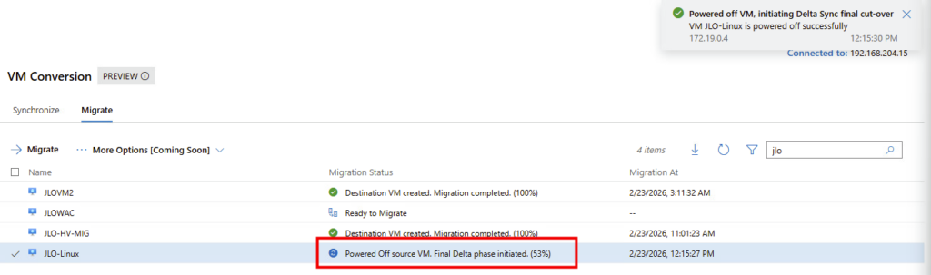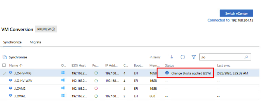 Migration : l’extension utilise la fonctionnalité Change Block Tracking (CBT) pour rechercher et répliquer uniquement les blocs modifiés depuis la dernière synchronisation. Pendant la transition, la machine virtuelle source est mise hors tension et une synchronisation delta finale capture toutes les modifications restantes avant d’importer la machine virtuelle dans Hyper-V.