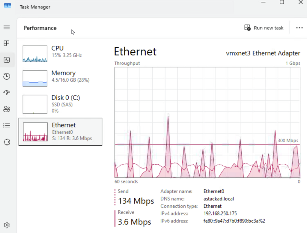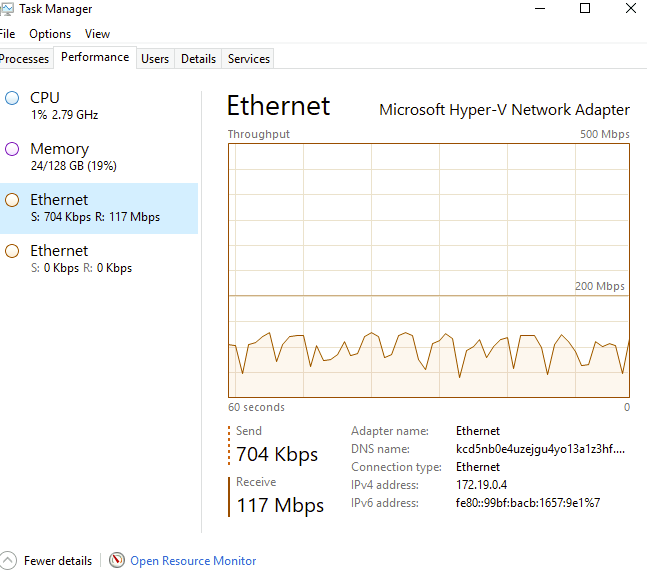 Le monitoring de la carte réseau montre bien le transfert des données :