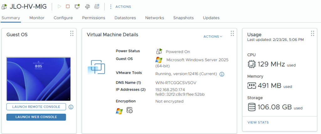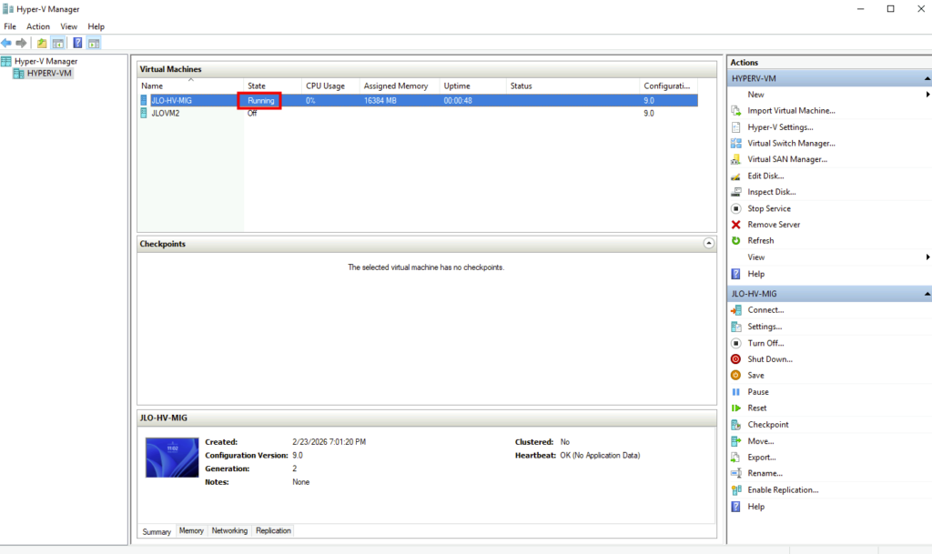 La VM migrée s’exécute désormais sur Hyper-V, confirmant le succès du cutover depuis l’environnement VMware :