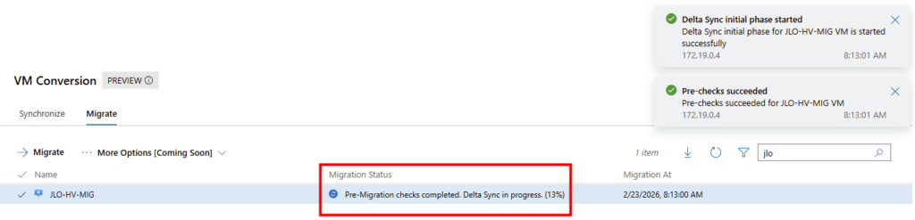 Delta Sync en cours : application des derniers blocs modifiés afin d’aligner définitivement la VM cible avant le cutover final vers Hyper-V.