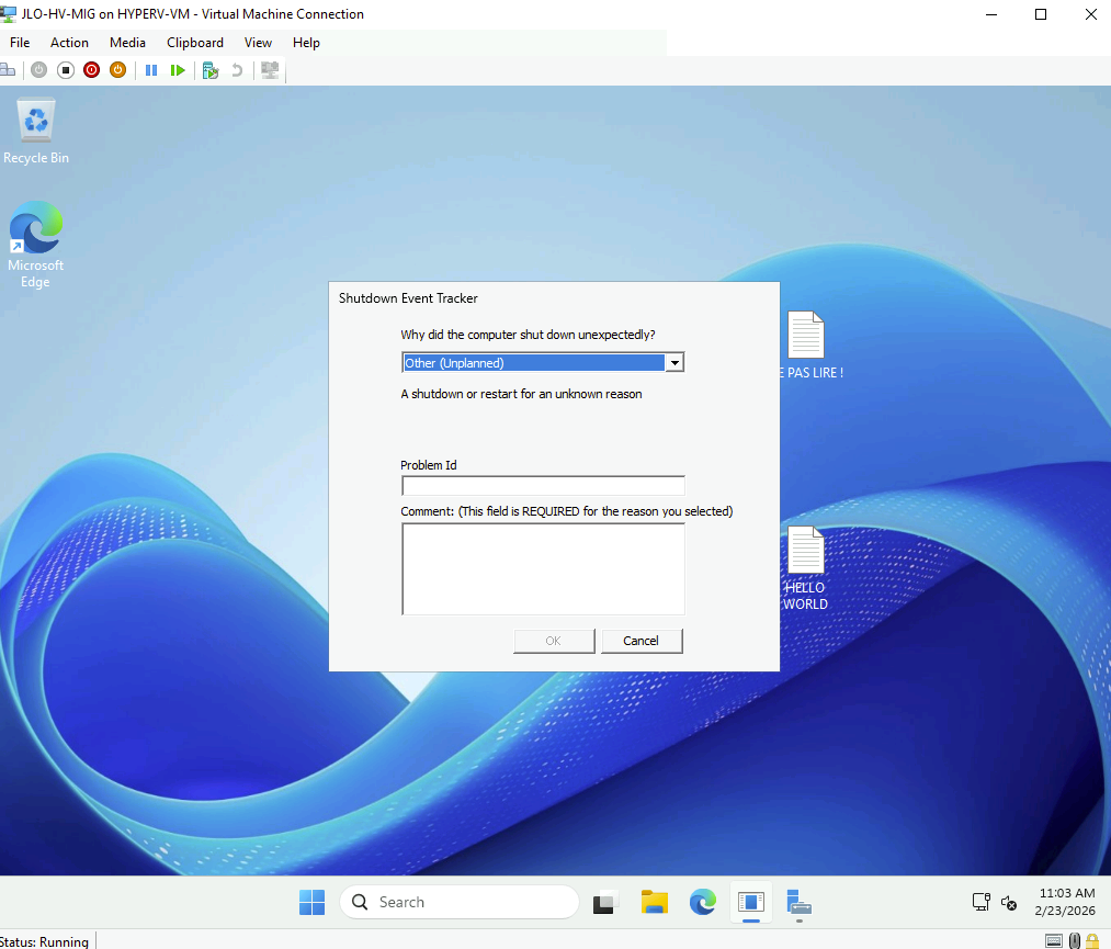 Windows détecte un arrêt inattendu lié au cutover, confirmant que la VM a bien été basculée depuis l’environnement VMware vers Hyper-V :