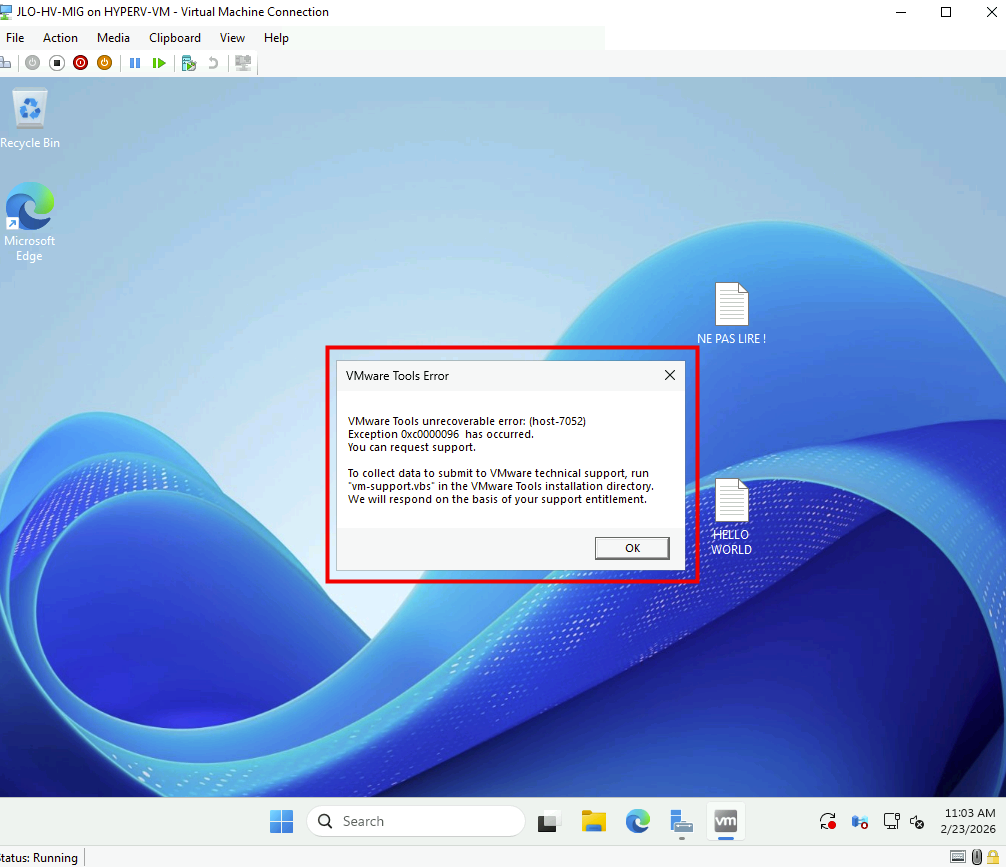 La présence de VMware Tools dans une VM sous Hyper-V peut provoquer des conflits de pilotes, donc il vaut mieux les retirer.