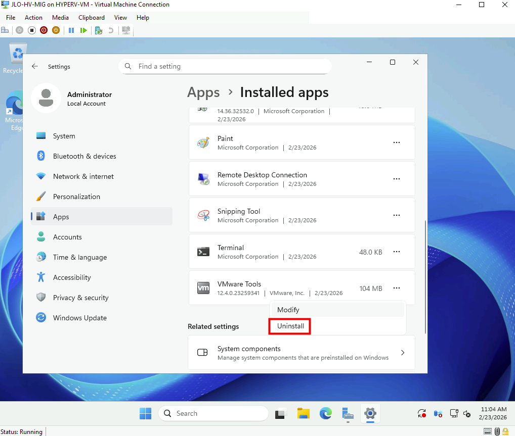 Erreur VMware Tools au premier démarrage : les anciens composants VMware, désormais incompatibles sous Hyper-V, doivent être désinstallés après la migration :