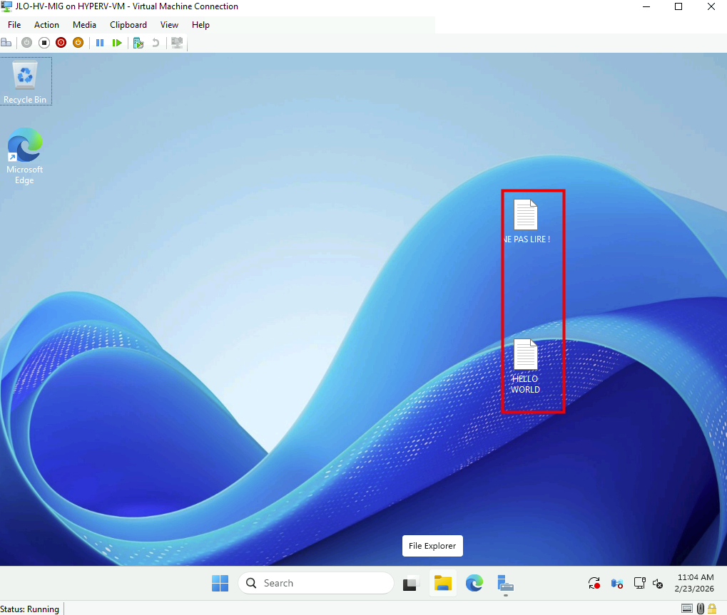 Les fichiers créés avant la commande Migrate sont bien présents après la bascule, confirmant l’intégrité de la synchronisation finale :