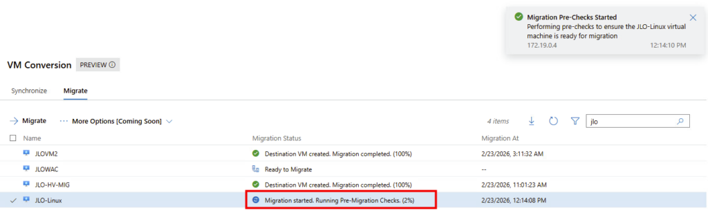 Lancement de la migration : exécution des vérifications préalables avant bascule définitive vers la VM Hyper-V cible :