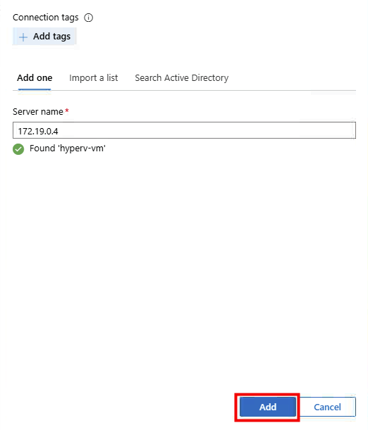 Renseignez l’adresse IP de votre Hyper-V, les éléments d’identification, puis cliquez sur Ajouter :