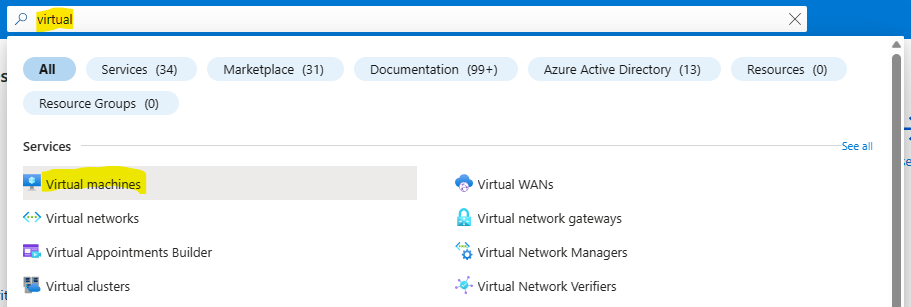 Depuis le portail Azure, commencez par rechercher le service des machines virtuelles :