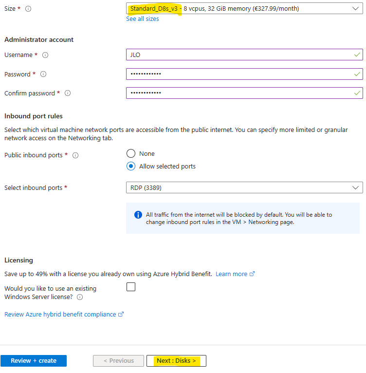 Choisissez une taille de machine virtuelle présent dans la famille Dsv3, puis cliquez sur Suivant :
