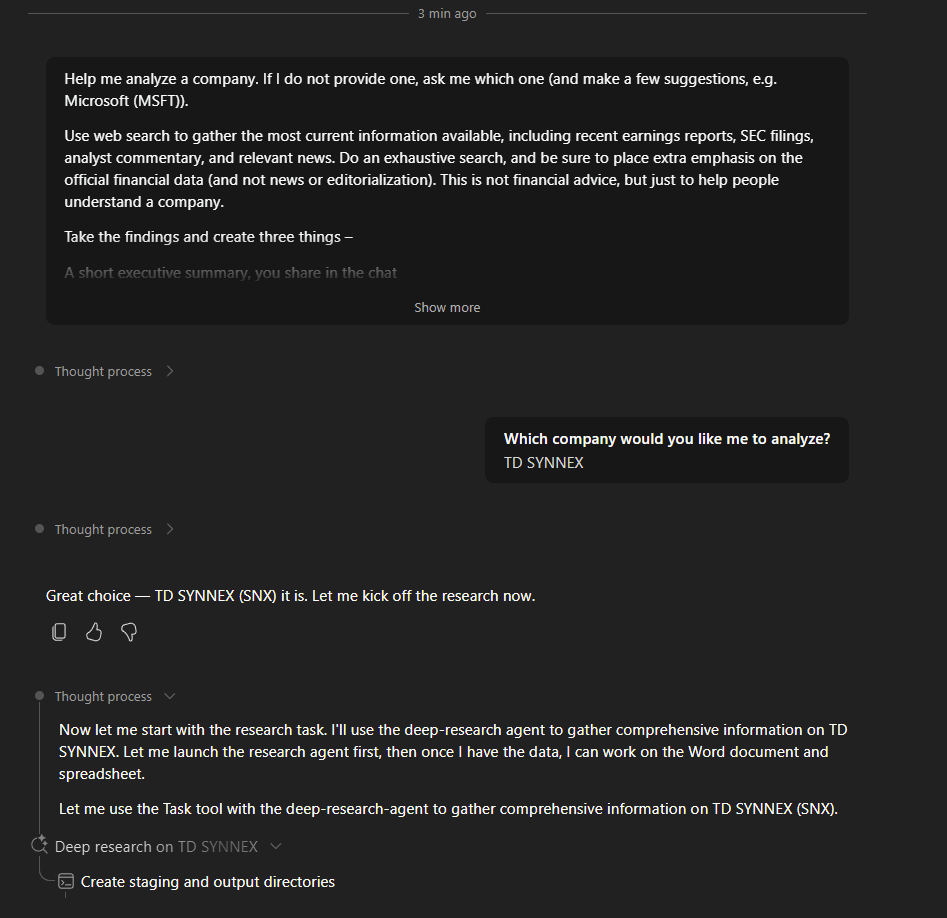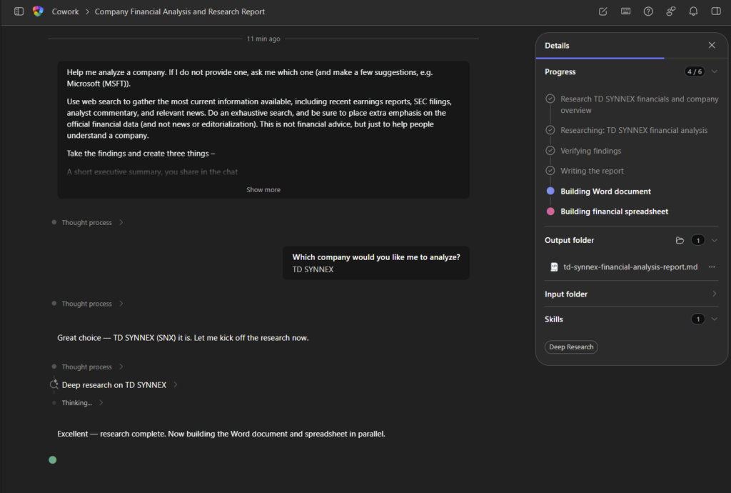 Sur cette autre capture, Cowork est passé de 0/6 à 4/6 : la recherche TD SYNNEX est terminée, il construit un fichier .md :