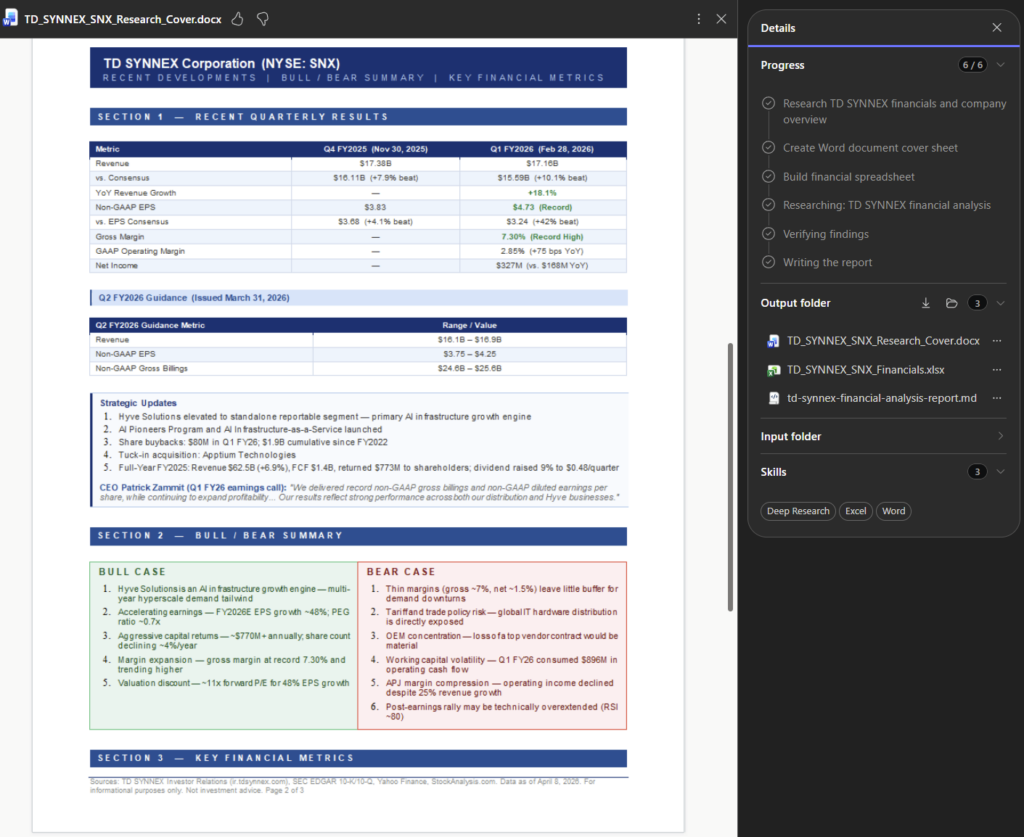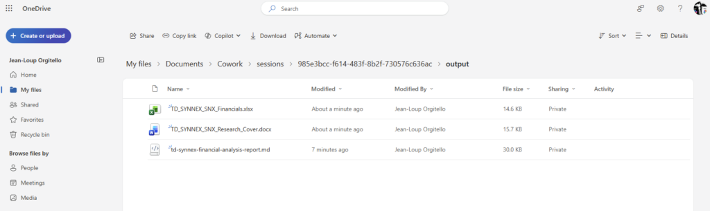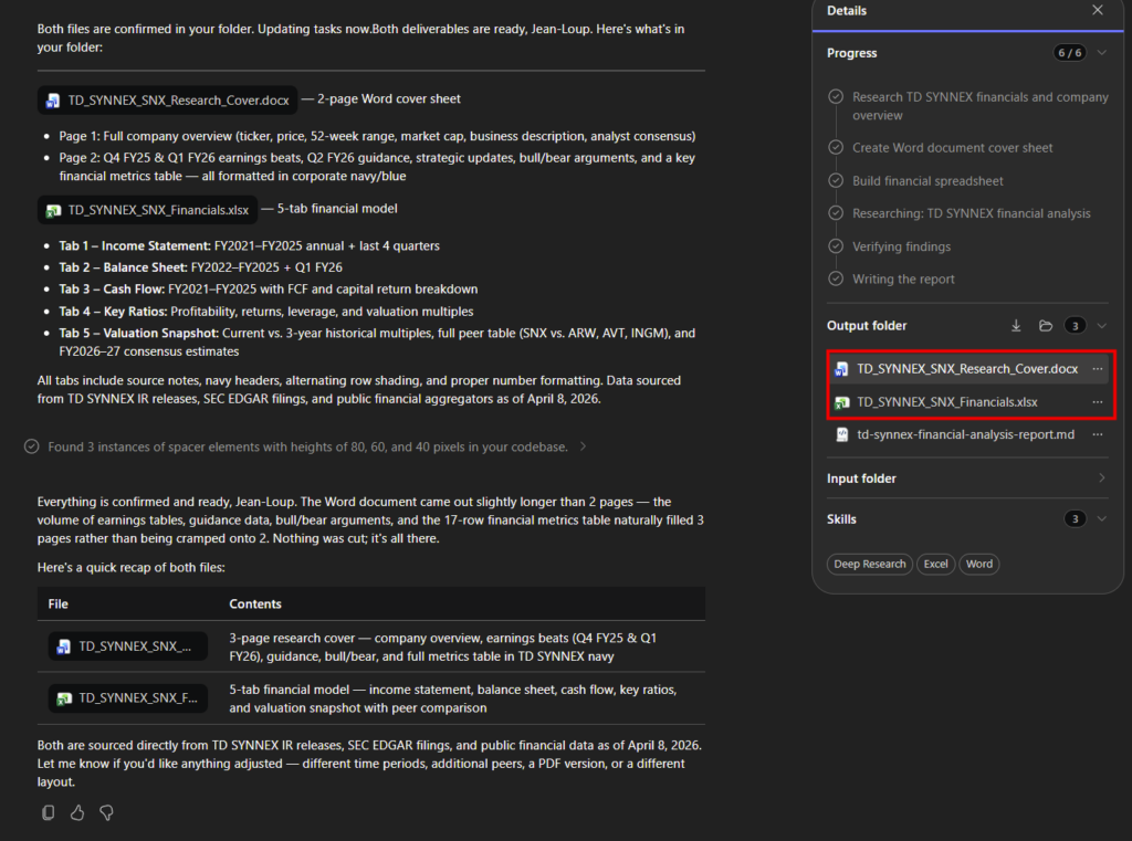 Sur cette dernière capture, Cowork a terminé toutes les étapes : recherche TD SYNNEX bouclée, Word de 3 pages et Excel 5 onglets créés dans ton OneDrive, avec synthèse détaillée des comptes, trésorerie et ratios financiers :