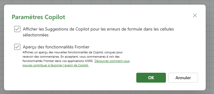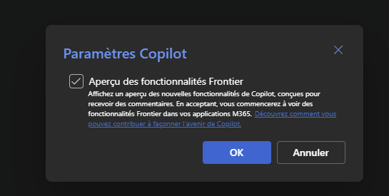 - Pour un compte Microsoft entreprise : Dans le cadre d’une entreprise, l’activation de Frontier est géré au niveau tenant. C’est donc l’administrateur IT de votre tenant qui doit l’activer pour que les utilisateurs puissent en profiter.