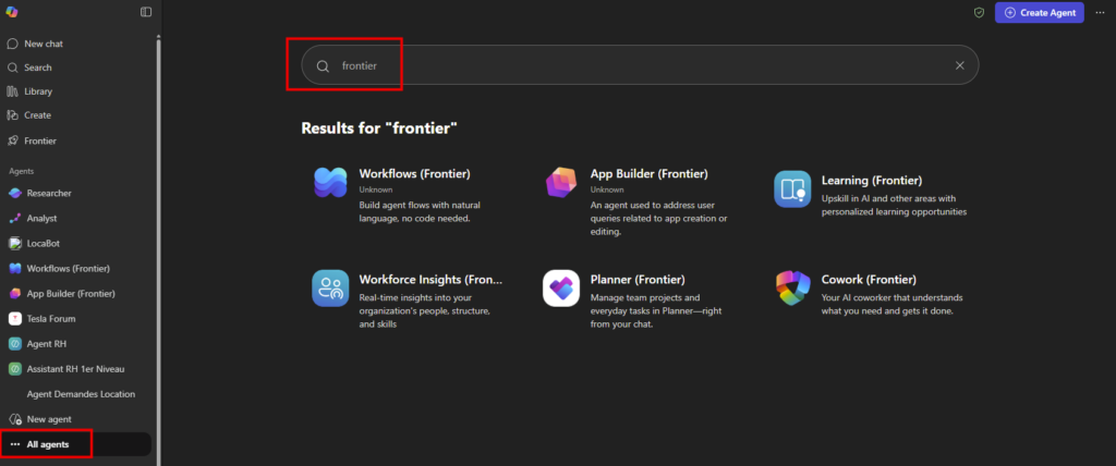 - Pour un compte Microsoft entreprise : Rendez-vous sur la page https://m365.cloud.microsoft, puis recherchez si les agents Frontier vous sont accessibles dans le catalogue :