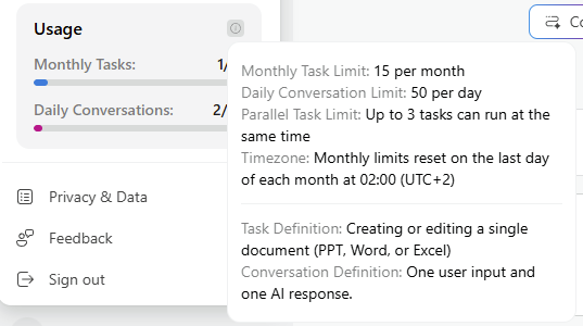 Mais, Microsoft ne communique pas beaucoup sur sa FAQ les limites mensuelles d’usage de Copilot Cowork dans sa documentation.