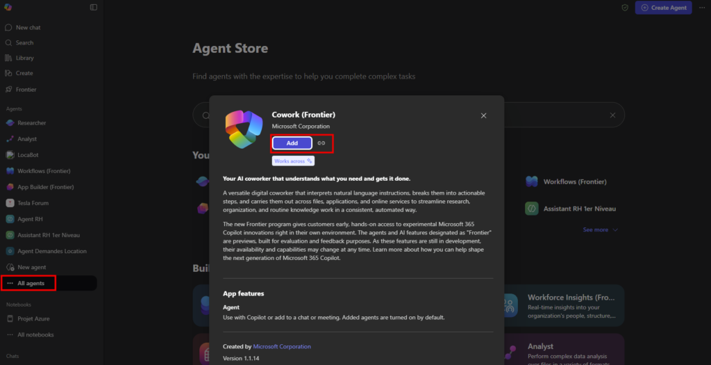 Pour cela, commencez par vous rendre sur la page web de Copilot, recherchez puis ajoutez Copilot Cowork ajouté à votre liste d’agents :