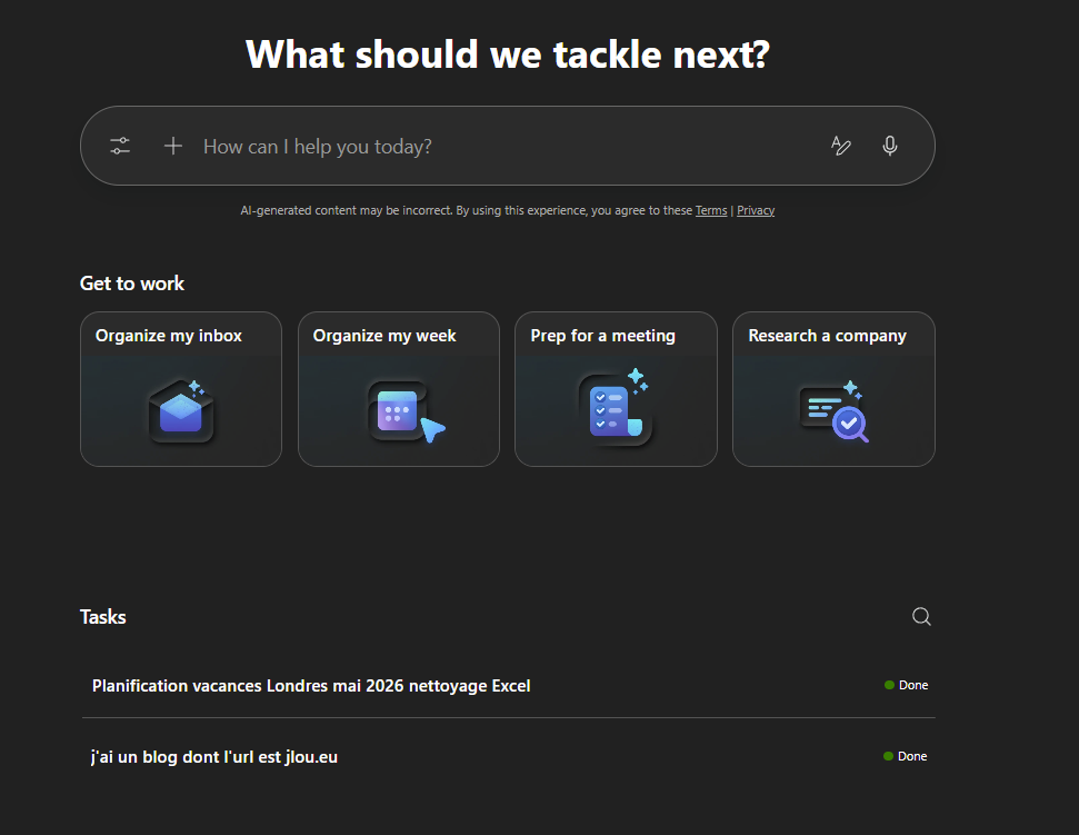 Une fois l’agent Copilot Cowork ajouté, ouvrez-le afin de constater les premières fonctionnalités :