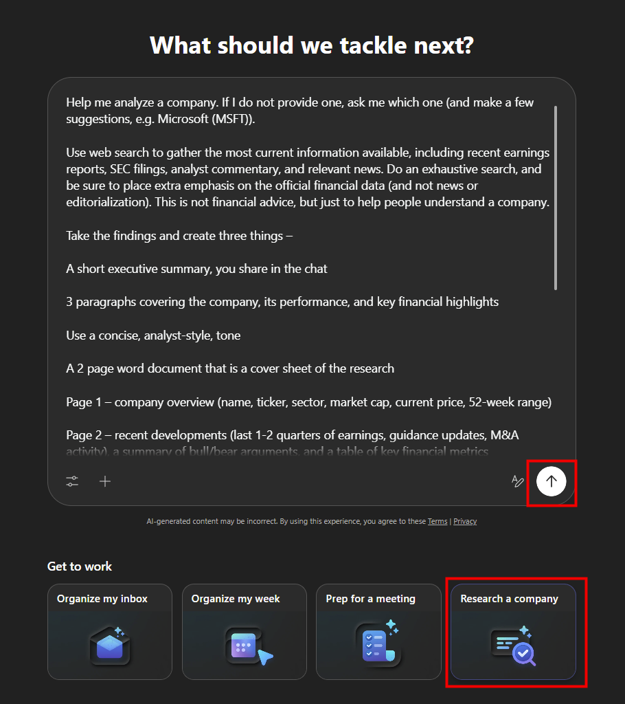 L’écran ressemble à Copilot Work, puis que les requêtes comment elles aussi par un prompt. Des tuiles sont également visibles afin de démarrer rapidement, Microsoft vous propose quatre cas d’usage de base :