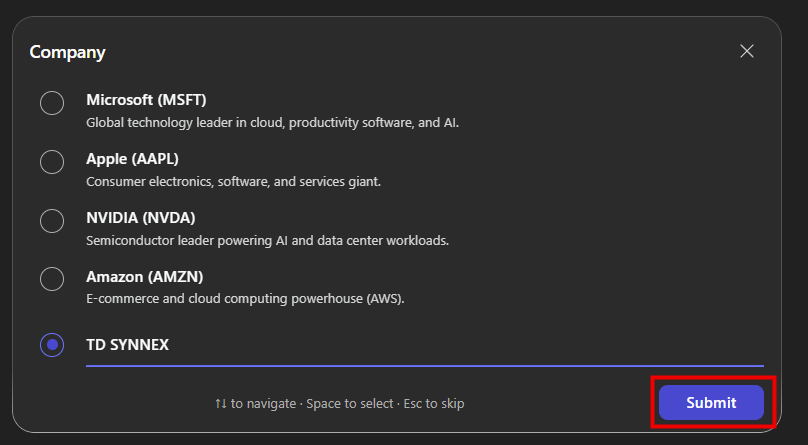 De façon assez logique Copilot Cowork a besoin de connaître le nom de l’entreprise pour effectuer sa recherche. Pour cela, un formulaire vous invite à lui fournir le nom :
