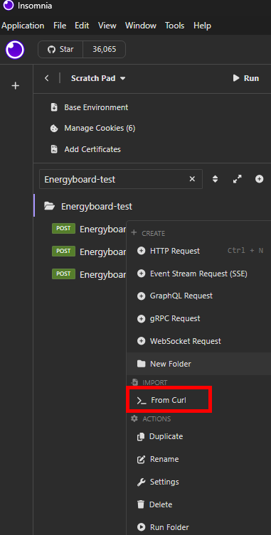 Retournez sur Insomnia afin d’effectuer un clique droit afin d’importer une nouvelle requête API :