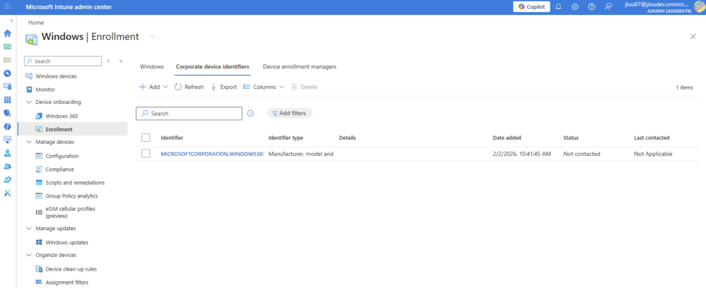 Les Corporate Device Identifiers permettent de dire à Intune que si un poste correspond à ces caractéristiques, il doit le considérer comme corporate dès le début de l’enrôlement.