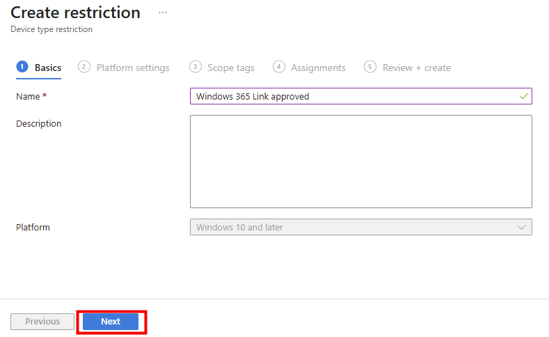 Au lieu d’identifier chaque Windows 365 Link individuellement via des numéros de série, il est possible de définir une restriction d’enrôlement particulière à Windows 365 Link, avec une priorité plus haute, et ciblée uniquement sur Windows 365 Link via un filtre Intune.