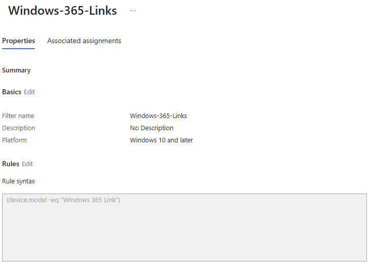 Spécifie la règle de filtrage selon la propriété suivante afin de ne prendre en compte que les appareils Windows 365 Link :