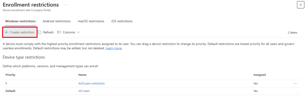 La règle doit être au-dessus de toute restriction d’enrôlement bloquante, pour cela, effectuez un glisser-déposer afin de changer la priorité de la restriction d’enrôlement dédiée au Windows 365 Link :