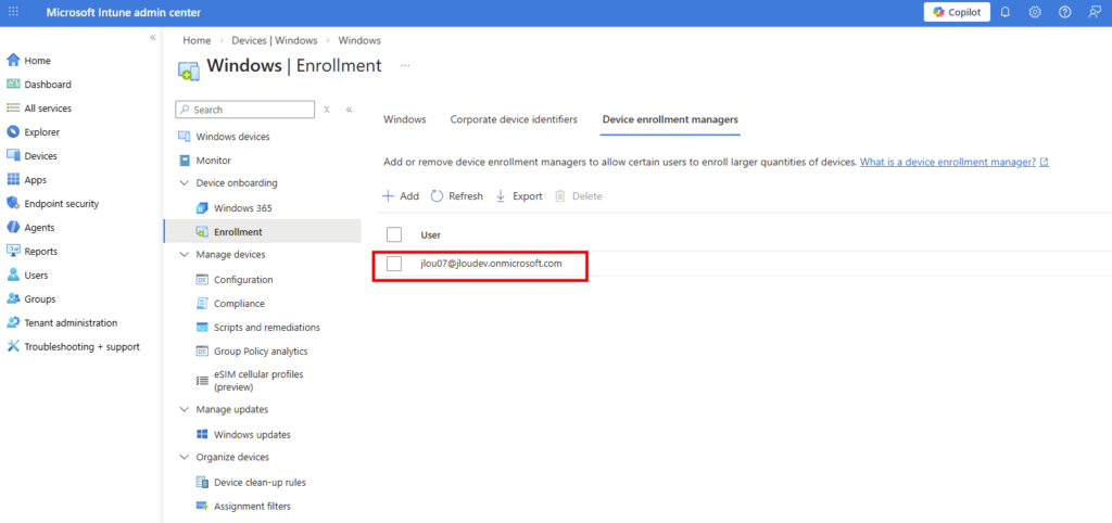 Un gestionnaire d’inscription d’appareil (DEM) est un utilisateur non administrateur qui peut inscrire des appareils dans Intune.